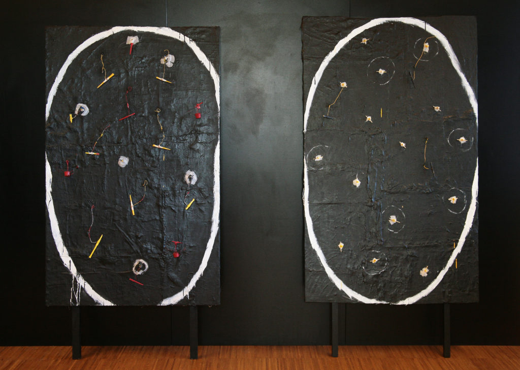 Appunti di viaggio (tela, garza, acrilico smalti su tavola; dimensioni: 230x130x5)