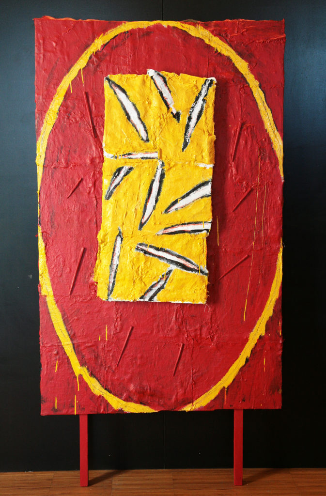 Oggetti volanti su fondo rosso (tela garza, acrilico smalti su tavola; dimensioni: 230x130x10)