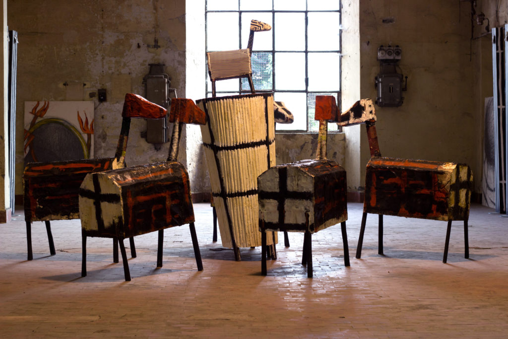 Guardiani attorno ad un covone (garza, metallo, gesso, legno, stoffa acrilici smalti; dimensioni: 220x75x75)